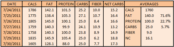 I finished my third week of the Leptin Reset Diet. I tracked my food every day this past week on Fitday. Here are the averages of what I ate: